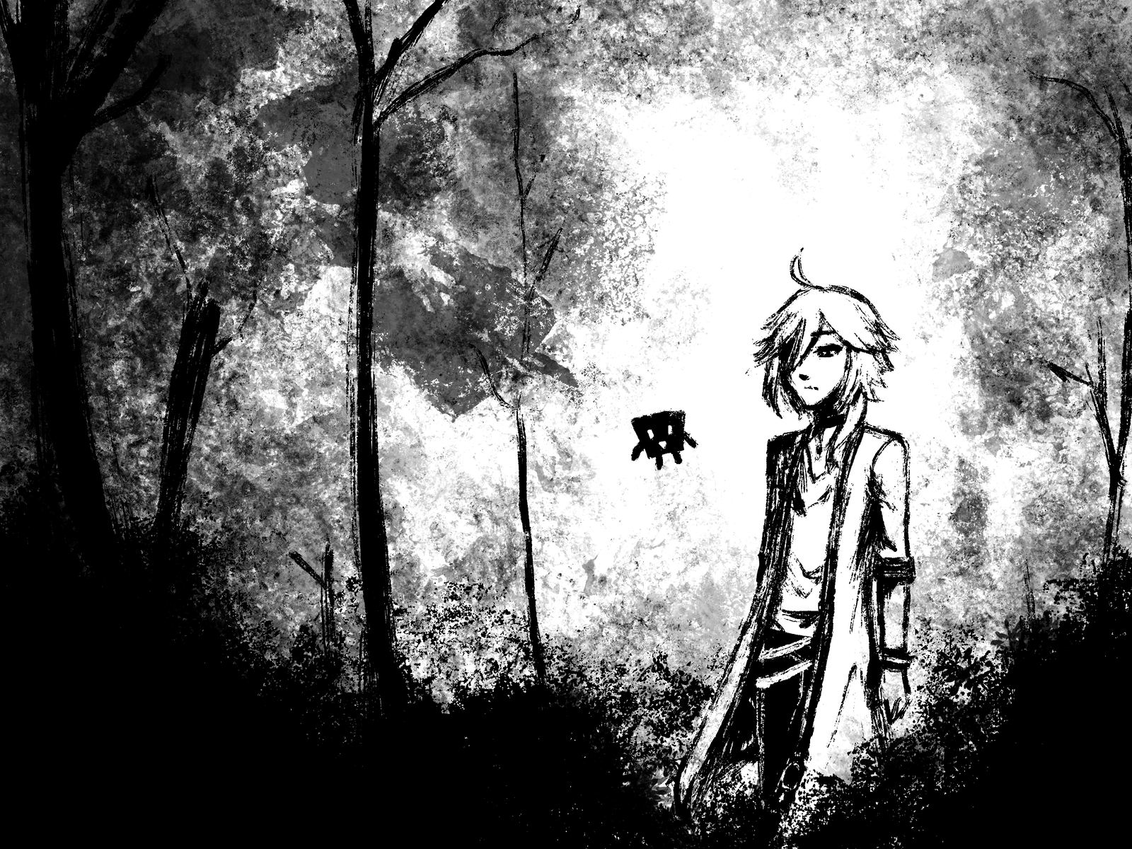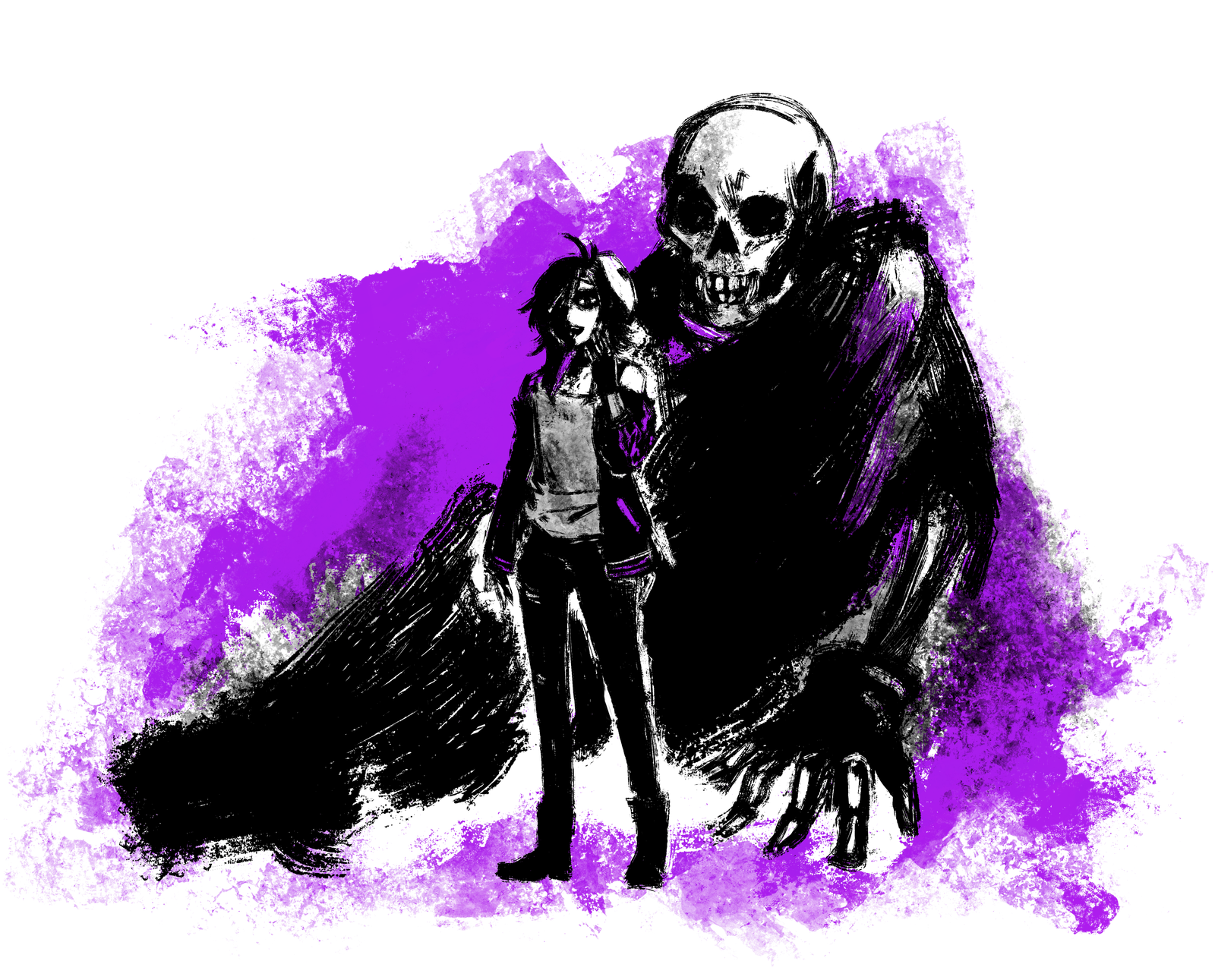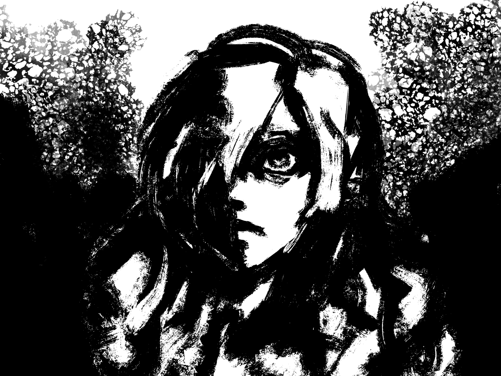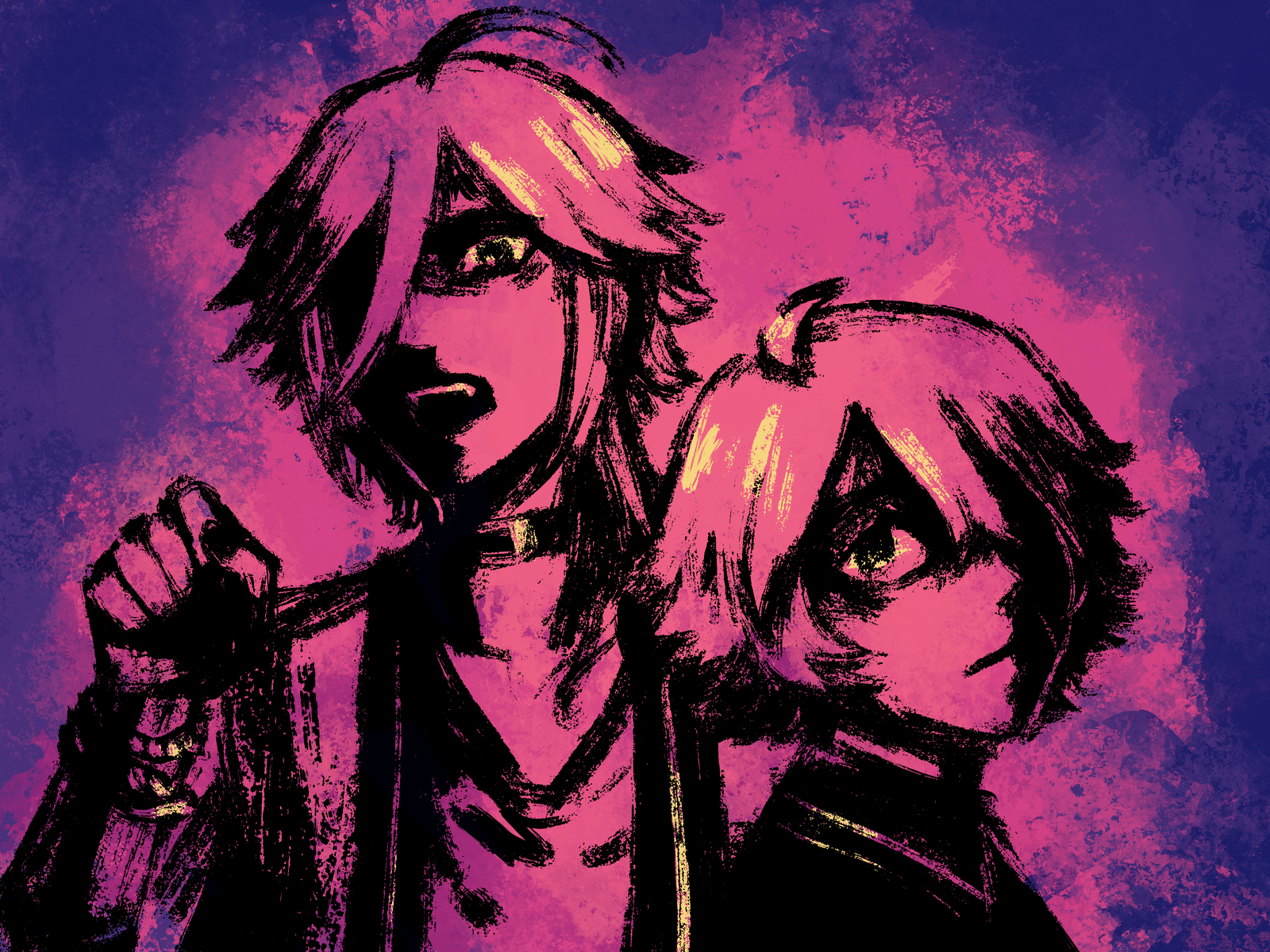 Digital sketches based on splotchy ink art with harsh shadows. These can only be done in black and white with limited colors. Character design details may be unclear or obscured by harsh shadows.